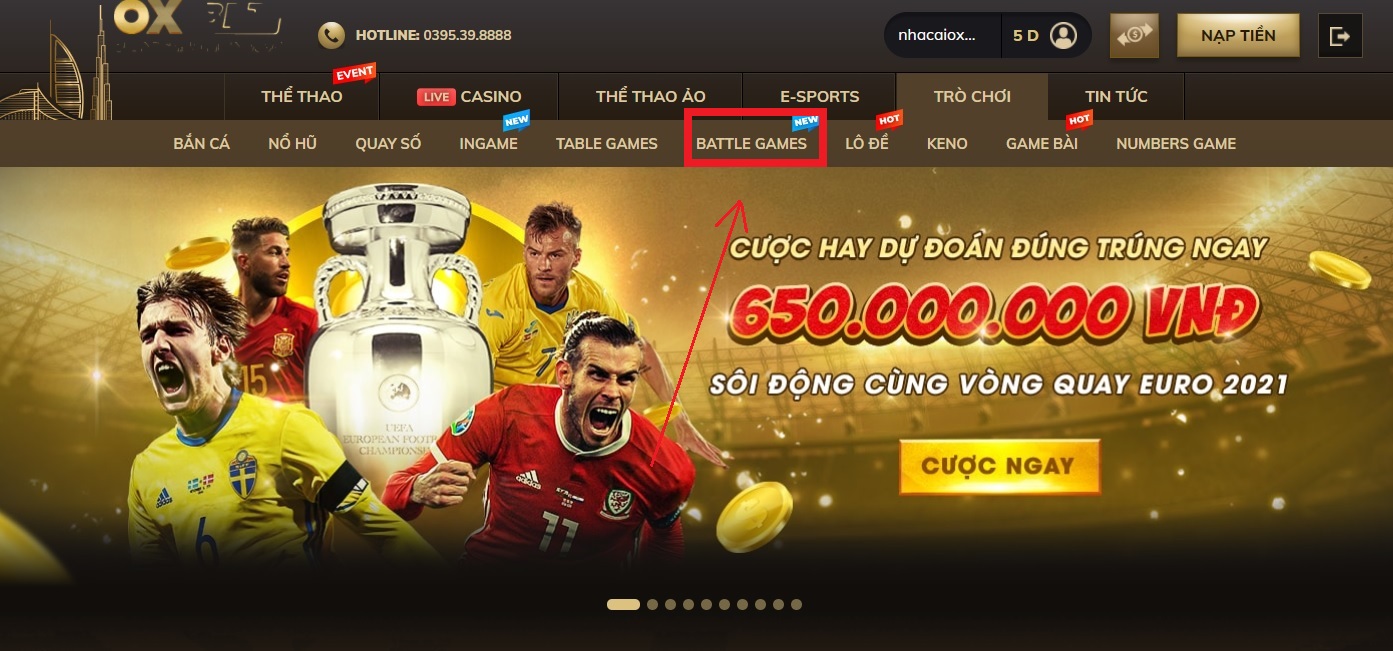 • Bước 1: Sau khi đăng nhập vào trang chủ của nhà cái Oxbet, chọn phần “Battle Games”.