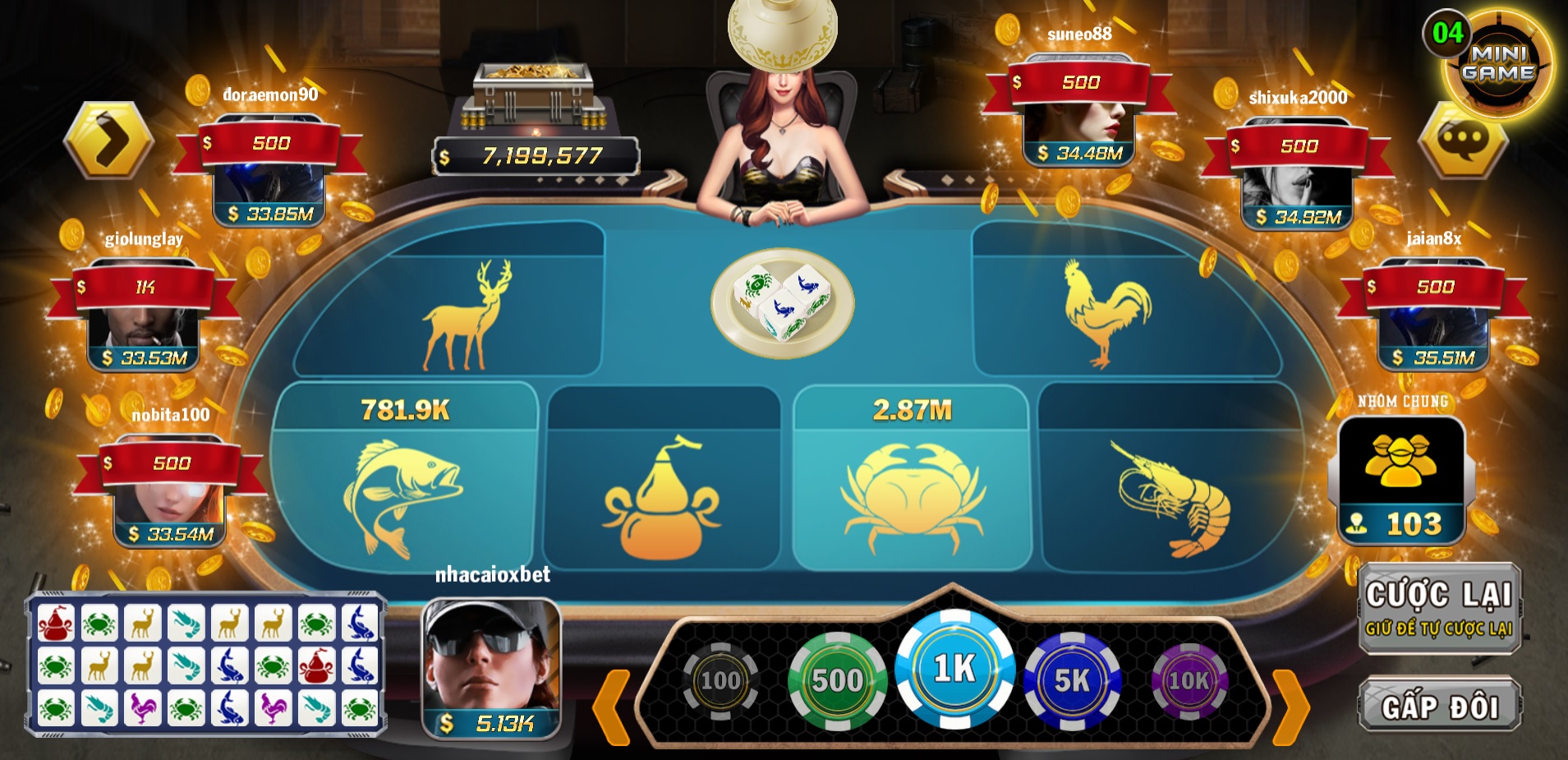 Bầu Cua là trò chơi quen thuộc với các anh em thích chơi đỏ đen. Trò chơi sử dụng 3 viên xúc xắc in hình 6 linh vật: Bầu, Cua, Cá, Tôm, Gà, Nai cùng với 1 cái bát. Nhà cái sẽ đặt 3 viên xúc xắc vào bát đậy kín và lắc mạnh, sau đó bạn lựa chọn cửa cược sẽ xuất hiện linh vật nào để đặt tiền.
