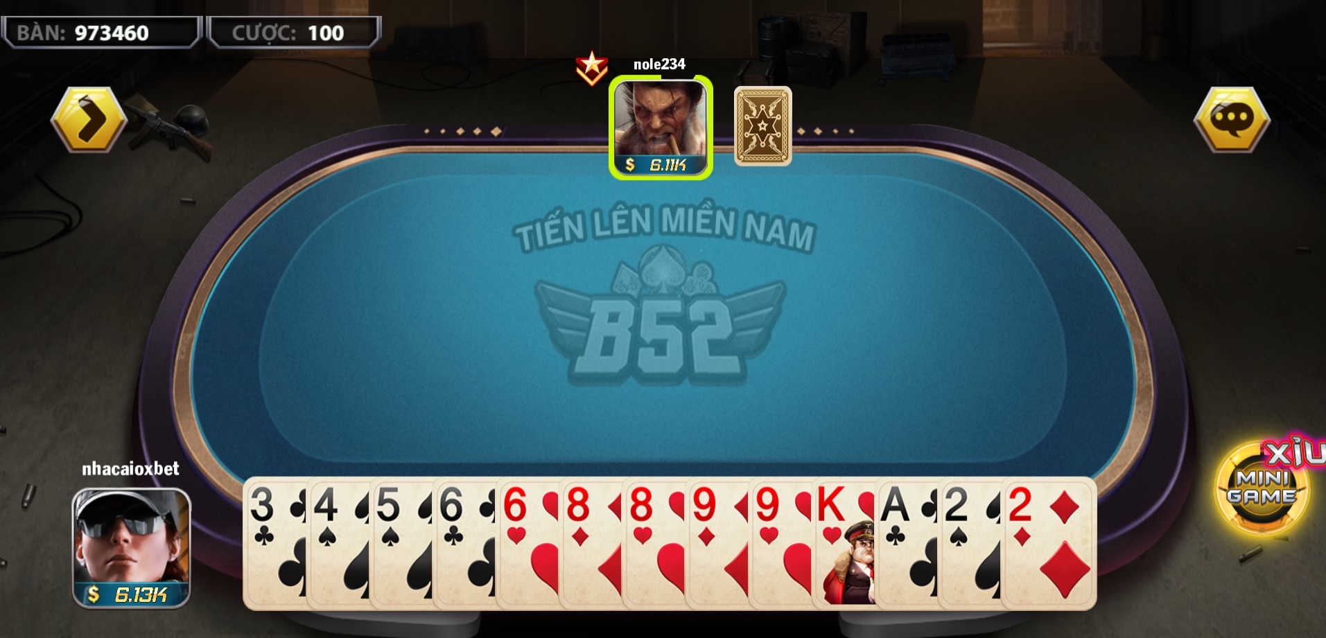 Trò Tiến Lên thì ai cũng biết cách chơi hết rồi. Các bàn chơi tại Oxbet có những mức cược trải dài từ 100 cho đến 50K một ván chơi. Nếu cảm thấy mình vô đối trong trò chơi này thì ngại gì mà không so tài với anh em 3 miền tại Oxbet.