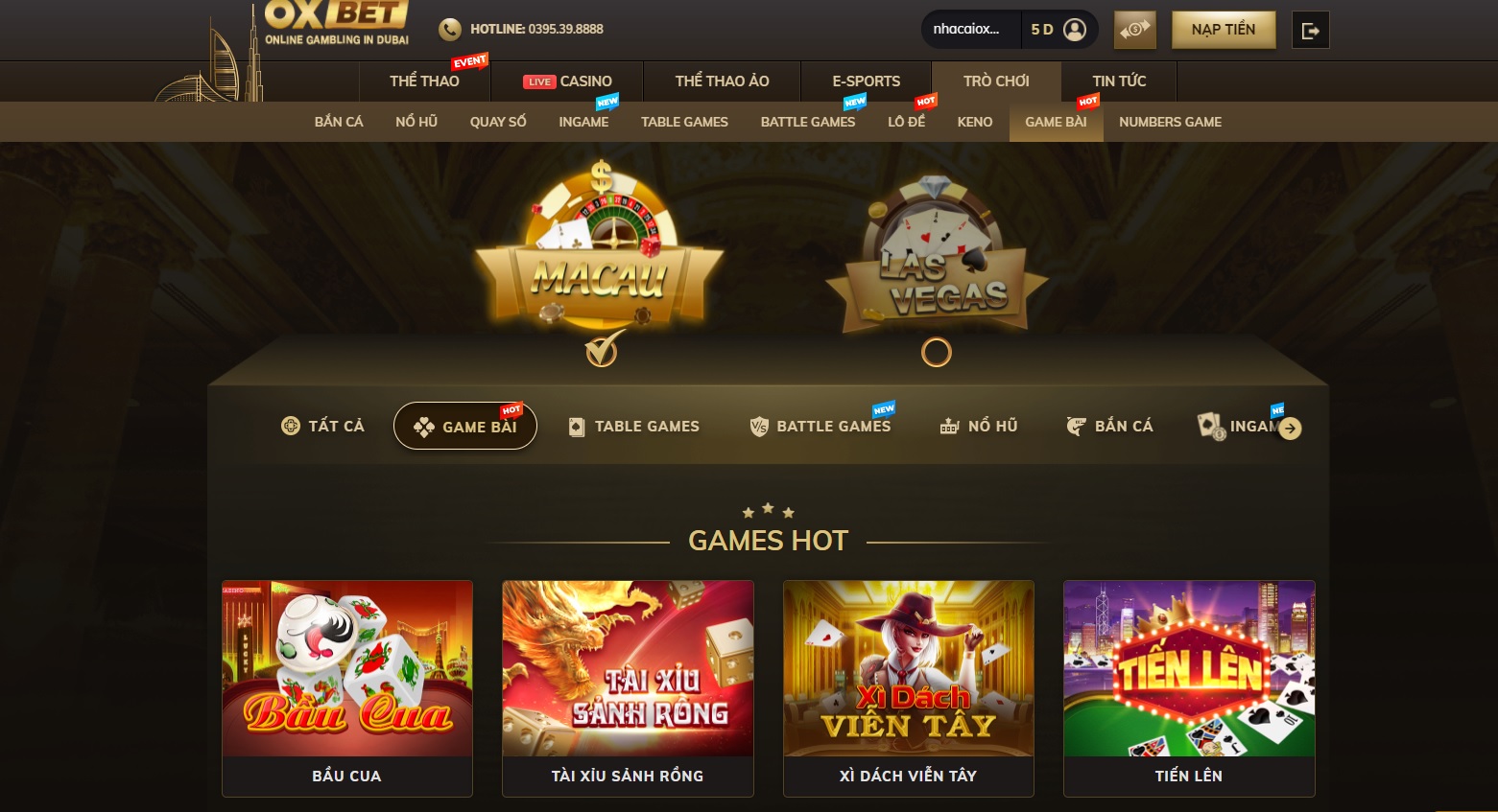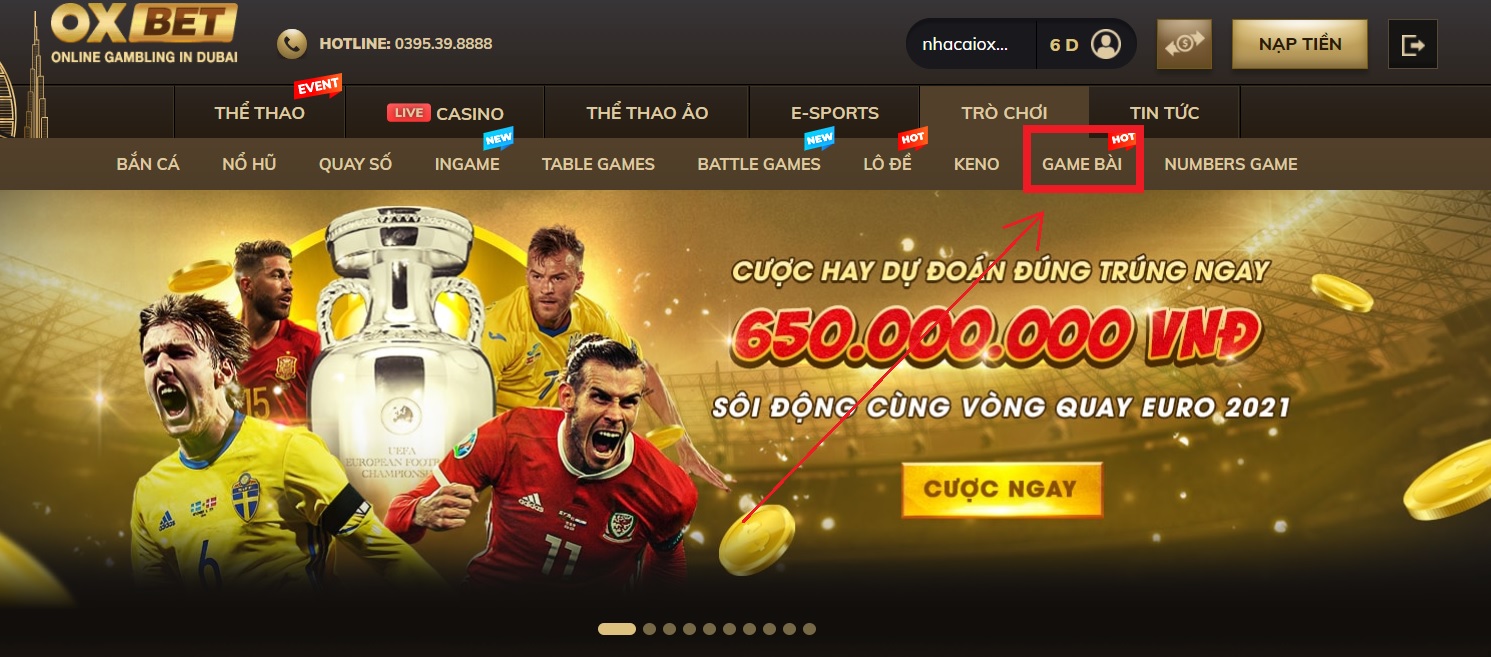 - Bước 1: Sau khi đăng nhập vào trang chủ của nhà cái Oxbet, chọn phần “Game Bài”.