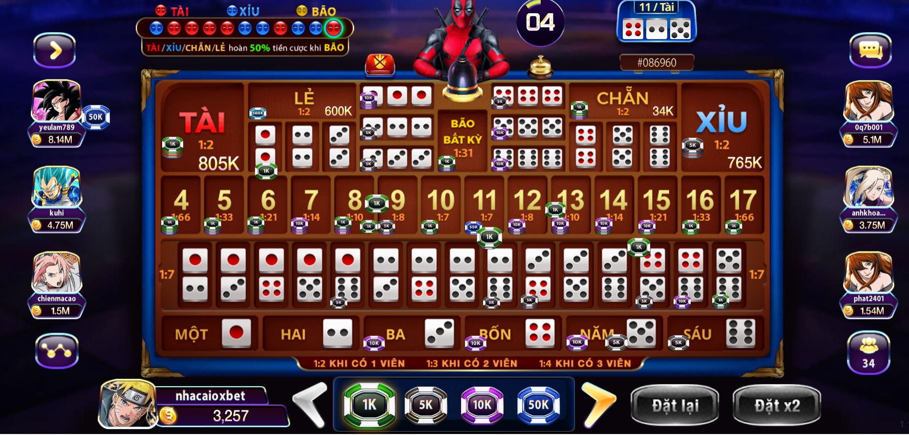 Cũng là game Sicbo nhưng nhà cái Oxbet đã biến tấu nó trở thành một trò chơi thú vị hơn nhiều. Thay mặt nhà cái sẽ là nhân vật Deadpool có nhiệm vụ lắc xí ngầu cho anh em biết kết quả. Số lượng người chơi trò này là vô cùng đông, trung bình mỗi ván chơi có khoảng 3000 – 5000 người chơi cược cùng một lúc.