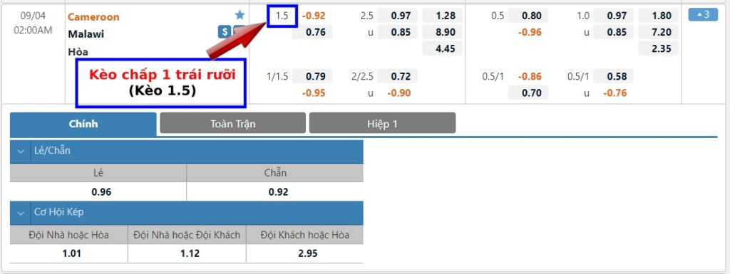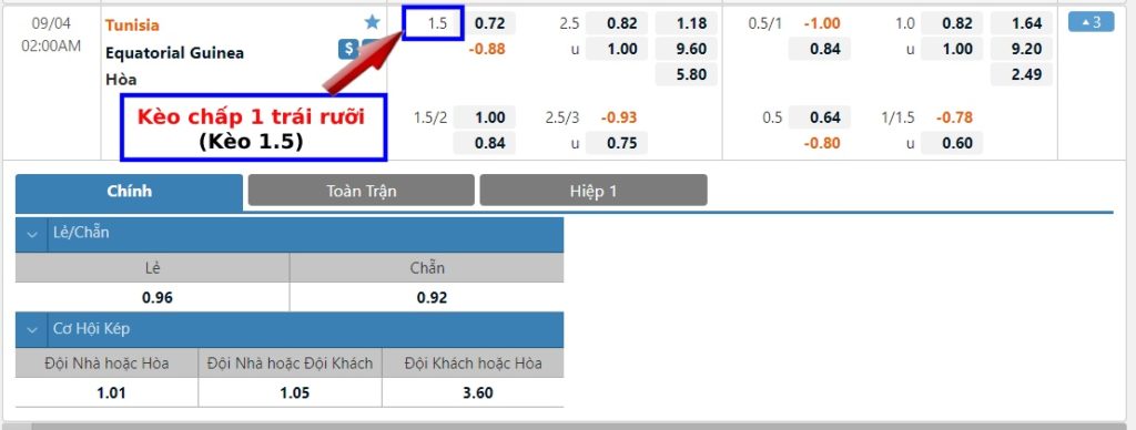 Ví dụ 1 về chơi kèo 1.5, 1 1/2 trái