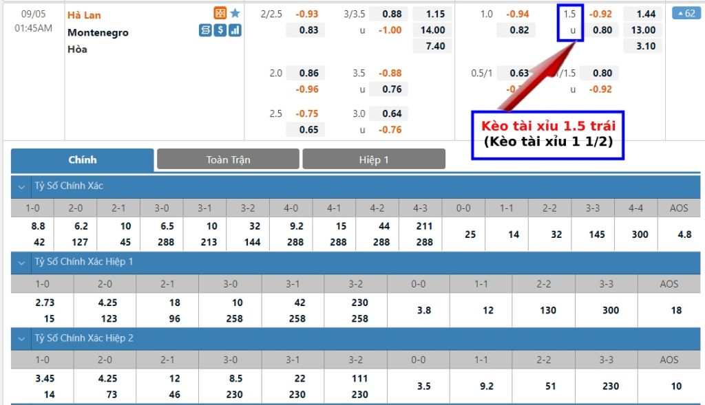 Tỷ lệ của kèo 1.5 cũng được sử dụng nhiều trong hiệp một của trận đấu. Đối với các trận đấu của hai đội có lối tấn công đẹp mắt rất ít xuất hiện kèo 1.5. Để chọn tài mà giành được phần thắng thì đội đó phải ghi được từ 2 bàn trở lên. Trường hợp có ít hơn hai bàn sẽ là người chọn xỉu thắng.