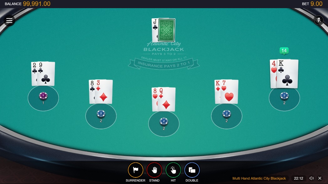 Trong game Atlantic City Blackjack sẽ có tới 5 vị trí chơi để bạn đặt cược, mỗi vị trí tương ứng với 2 lá bài khác nhau. Anh em có thể chọn một trong 4 lệnh như Surrender (bỏ bài), Stand (giữ bài), Hit và Double.