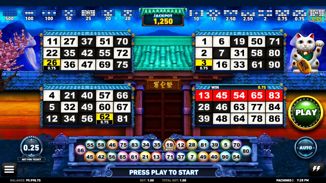 Pachinko là game Casino thương hiệu của Microgaming, người chơi có cơ hội nhận được phần thưởng tối đa x5000 lần mức cược. Sau khi nhấn nút ‘Play’, một dãy gồm 30 quả bóng sẽ được chạy dưới màn hình. Nếu kết quả của 30 quả bóng này tạo nên dòng thắng trên các bảng số, người chơi sẽ nhận được tiền thưởng tương ứng.
