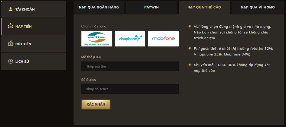 Chọn hình thức rút tiền qua thẻ cào điện thoại.