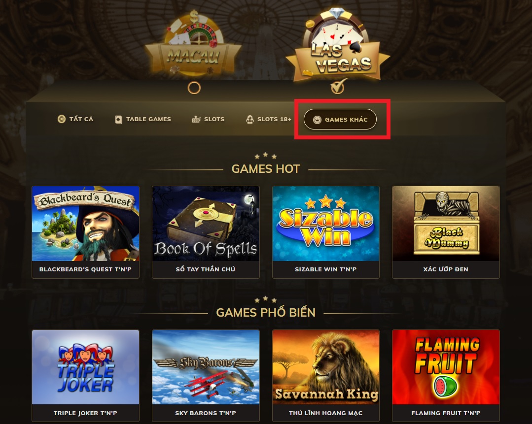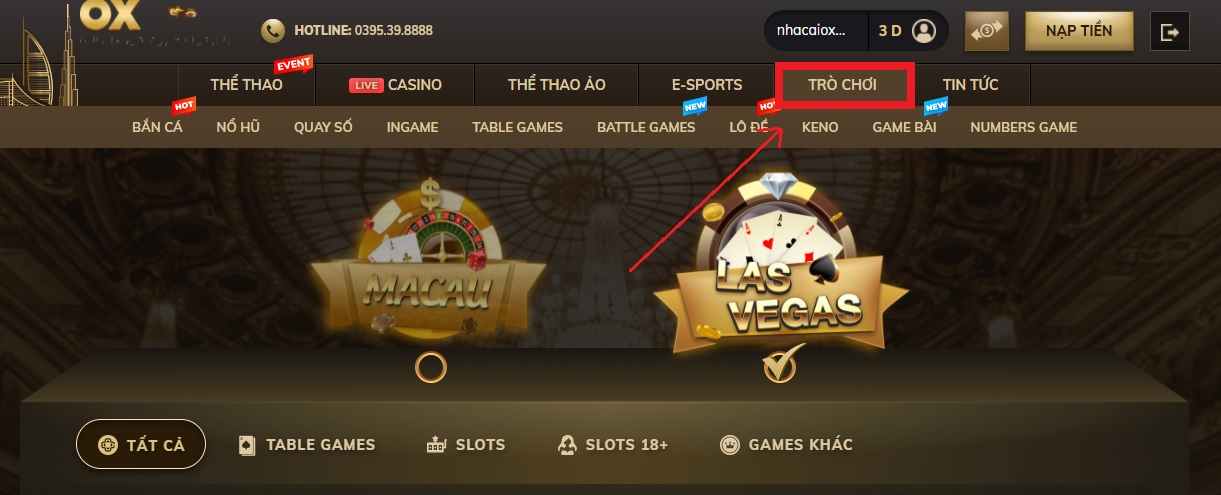 • Bước 3: Chọn danh mục “Trò Chơi” ở ngay phía trên trang chủ. Lúc này sẽ có 2 khu vực là Macau và Las Vegas hiện ra, lựa chọn Las Vegas.